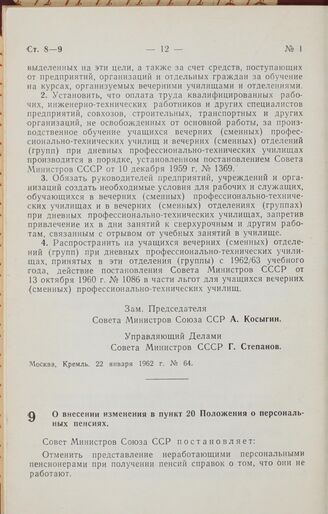 Постановление Совета Министров СССР. О внесении изменения в пункт 20 Положения о персональных пенсиях. 22 января 1962 г. № 66