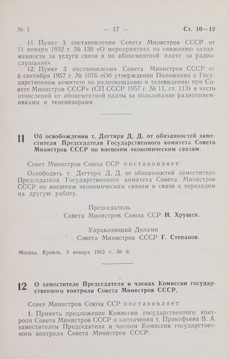 Постановление Совета Министров СССР. О заместителе Председателя и членах Комиссии государственного контроля Совета Министров СССР. 11 января 1962 г. № 29