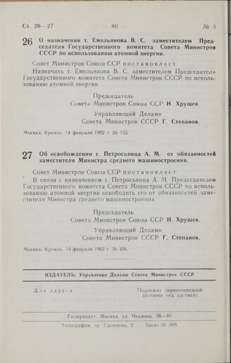 Постановление Совета Министров СССР. О назначении т. Емельянова В. С. заместителем Председателя Государственного комитета Совета Министров СССР по использованию атомной энергии. 14 февраля 1962 г. № 155