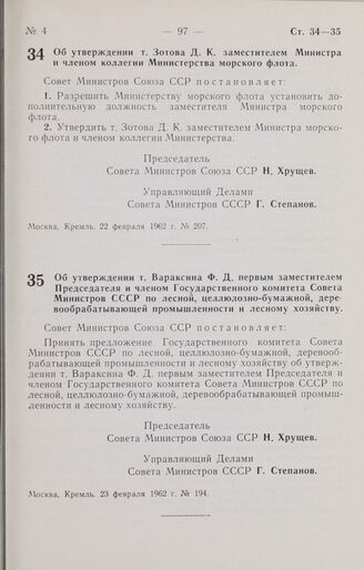 Главная Собрание законов и распоряжений правительства РСФСР и СССР Собрание законов и распоряжений Рабоче-Крестьянского Правительства ... Собрание постановлений правительства СССР за 1962 г. № 1-21 Документы Постановление Совета Министров СССР. Об утверждении т. Вараксина Ф....