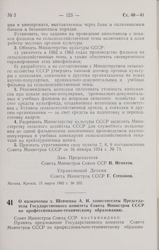 Постановление Совета Министров СССР. О назначении т. Шевченко А. И. заместителем Председателя Государственного комитета Совета Министров СССР по профессионально-техническому образованию. 13 марта 1962 г. № 248