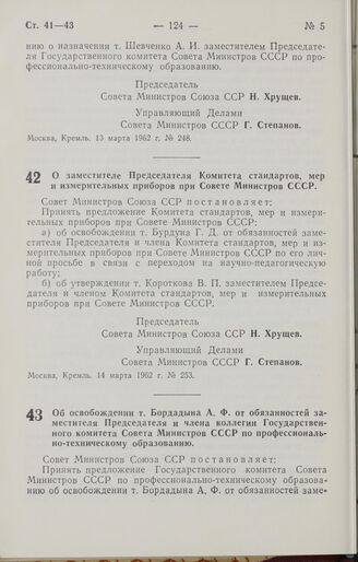 Постановление Совета Министров СССР. О заместителе Председателя Комитета стандартов, мер и измерительных приборов при Совете Министров СССР. 14 марта 1962 г. № 253