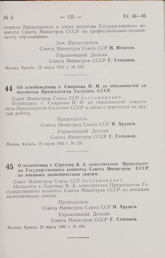 Постановление Совета Министров СССР. О назначении т. Сергеева В. А. заместителем Председателя Государственного комитета Совета Министров СССР по внешним экономическим связям. 23 марта 1962 г. № 265