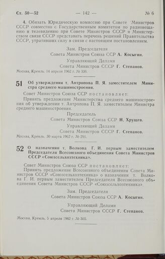 Постановление Совета Министров СССР. О назначении т. Волкова Г. И. первым заместителем Председателя Всесоюзного объединения Совета Министров СССР «Союзсельхозтехника». 5 апреля 1962 г. № 305