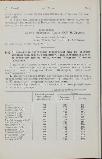 Главная Собрание законов и распоряжений правительства РСФСР и СССР Собрание законов и распоряжений Рабоче-Крестьянского Правительства ... Собрание постановлений правительства СССР за 1962 г. № 1-21 Документы Постановление Совета Министров СССР. О повышении закупочных (сдаточ...