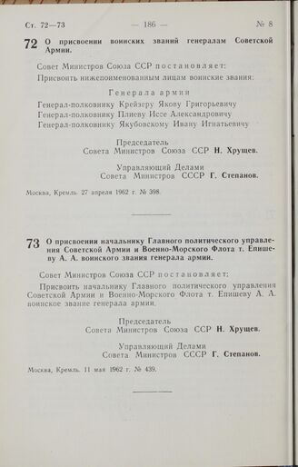 Постановление Совета Министров СССР. О присвоении начальнику Главного политического управления Советской Армии и Военно-Морского Флота т. Епишеву А. А. воинского звания генерала армии. 11 мая 1962 г. № 439