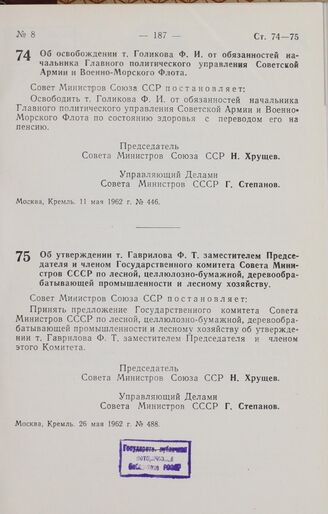 Постановление Совета Министров СССР. Об освобождении т. Голикова Ф. И. от обязанностей начальника Главного политического управления Советской Армии и Военно-Морского Флота. 11 мая 1962 г. № 446