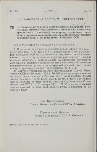 Постановление Совета Министров СССР. О сезонных закупочных и сдаточных ценах на крупный рогатый скот, свиней, птицу, кроликов, сливки и масло животное, продаваемые (сдаваемые) государству колхозами, совхозами и другими государственными сельскохозя...