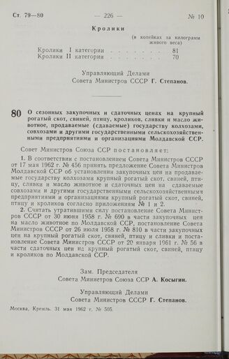 Постановление Совета Министров СССР. О сезонных закупочных и сдаточных ценах на крупный рогатый скот, свиней, птицу, кроликов, сливки и масло животное, продаваемые (сдаваемые) государству колхозами, совхозами и другими государственными сельскохозя...
