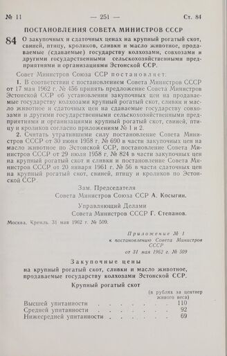 Постановление Совета Министров СССР. О закупочных и сдаточных ценах на крупный рогатый скоту свиней, птицу, кроликов, сливки и масло животное, продаваемые (сдаваемые) государству колхозами, совхозами и другими государственными сельскохозяйственным...