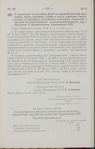 Постановление Совета Министров СССР. О закупочных и сдаточных ценах на крупный рогатый скот, свиней, птицу, кроликов, сливки и масло животное, продаваемые (сдаваемые) государству колхозами, совхозами и другими государственными сельскохозяйственным...
