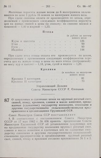 Постановление Совета Министров СССР. О закупочных и сдаточных ценах на крупный рогатый скот, свиней, птицу, кроликов, сливки и масло животное, продаваемые (сдаваемые) государству колхозами, совхозами и другими государственными сельскохозяйственным...
