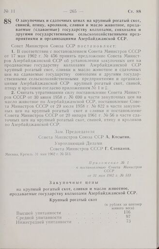 Постановление Совета Министров СССР. О закупочных и сдаточных ценах на крупный рогатый скот, свиней, птицу, кроликов, сливки и масло животное, продаваемые (сдаваемые) государству колхозами, совхозами и другими государственными сельскохозяйственным...