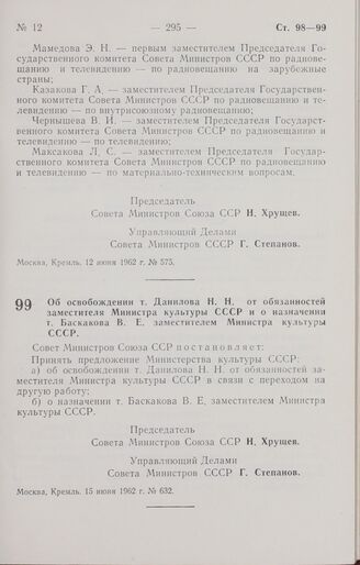 Постановление Совета Министров СССР. Об освобождении т. Данилова Н. Н. от обязанностей заместителя Министра культуры СССР и о назначении т. Баскакова В. Е. заместителем Министра культуры СССР. 15 июня 1962 г. № 632