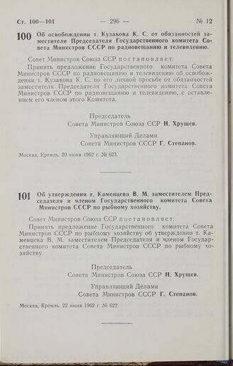 Постановление Совета Министров СССР. Об утверждении т. Каменцева В. М. заместителем Председателя и членом Государственного комитета Совета Министров СССР по рыбному хозяйству. 22 июня 1962 г. № 622
