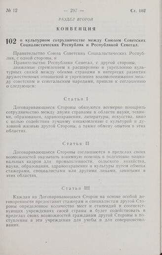 Конвенция о культурном сотрудничестве между Союзом Советских Социалистических Республик и Республикой Сенегал. 14 июня 1962 г.