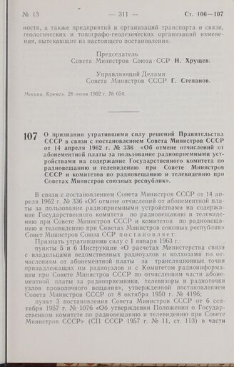 Главная Собрание законов и распоряжений правительства РСФСР и СССР Собрание законов и распоряжений Рабоче-Крестьянского Правительства ... Собрание постановлений правительства СССР за 1962 г. № 1-21 Документы Постановление Совета Министров СССР. О признании утратившими силу р...
