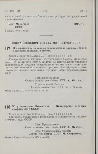 Постановление Совета Министров СССР. О награждении медалями оканчивающих заочные средние общеобразовательные школы. 3 августа 1962 г. № 782