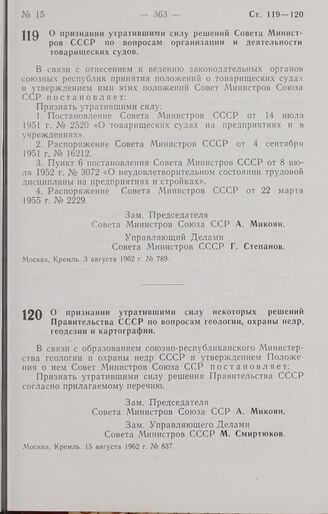 Главная Собрание законов и распоряжений правительства РСФСР и СССР Собрание законов и распоряжений Рабоче-Крестьянского Правительства ... Собрание постановлений правительства СССР за 1962 г. № 1-21 Документы Постановление Совета Министров СССР. О признании утратившими силу н...