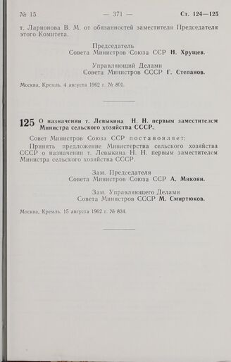 Постановление Совета Министров СССР. О назначении т. Левыкина Н. Н. первым заместителем Министра сельского хозяйства СССР. 15 августа 1962 г. № 834