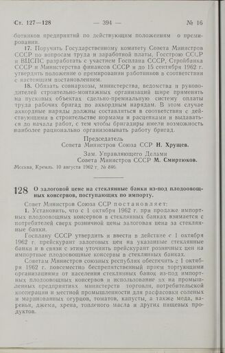 Постановление Совета Министров СССР. О залоговой цене на стеклянные банки из-под плодоовощных консервов, поступающих по импорту. 18 августа 1962 г. № 855