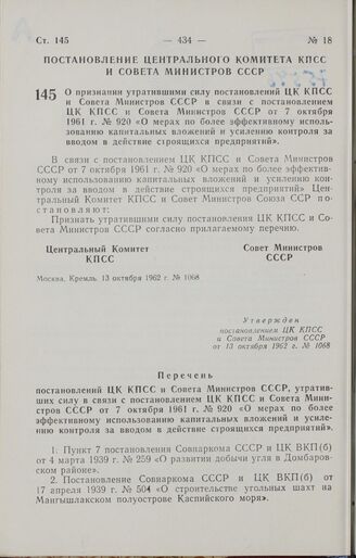 Постановление Центрального Комитета КПСС и Совета Министров СССР. О признании утратившими силу постановлений ЦК КПСС и Совета Министров СССР в связи с постановлением ЦК КПСС и Совета Министров СССР от 7 октября 1961 г. № 920 «О мерах по более эффективному использованию капитальных вложений и усилению контроля за вводом в действие строящихся предприятий». 13 октября 1962 г. № 1068