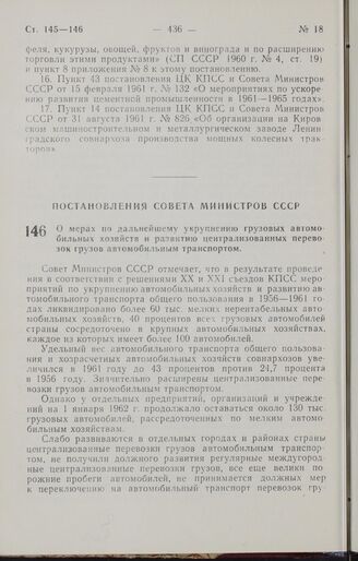 Постановление Совета Министров СССР. О мерах по дальнейшему укрупнению грузовых автомобильных хозяйств и развитию централизованных перевозок грузов автомобильным транспортом. 27 сентября 1962 г. № 1024