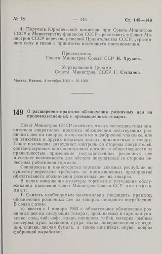 Постановление Совета Министров СССР. О расширении практики обозначения розничных цен на продовольственных и промышленных товарах. 6 октября 1962 г. № 1038