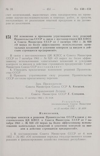 Постановление Совета Министров СССР. Об изменении и признании утратившими силу решений Правительства СССР в связи с постановлением ЦК КПСС и Совета Министров СССР от 7 октября 1961 г. № 920 «О мерах по более эффективному использованию капитальных вложений и усилению контроля за вводом в действие строящихся предприятий». 11 октября 1962 г. № 1058
