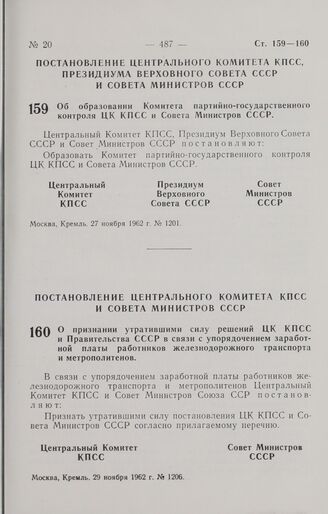 Постановление Центрального Комитета КПСС и Совета Министров СССР. О признании утратившими силу решений ЦК КПСС и Правительства СССР в связи с упорядочением заработной платы работников железнодорожного транспорта и метрополитенов. 29 ноября 1962 г. № 1206