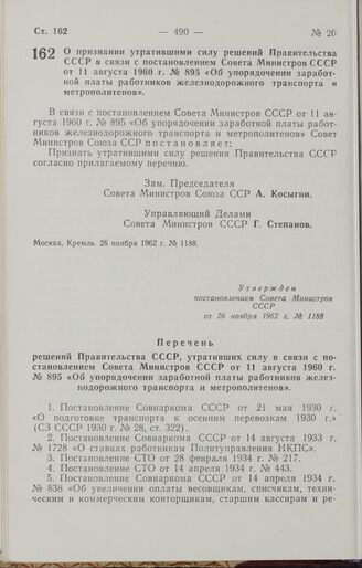 Постановление Совета Министров СССР. О признании утратившими силу решений Правительства СССР в связи с постановлением Совета Министров СССР от 11 августа 1960 г. № 895 «Об упорядочении заработной платы работников железнодорожного транспорта и метрополитенов». 26 ноября 1962 г. № 1188