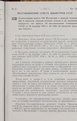 Постановление Совета Министров СССР. О дополнении пункта 149 Положения о порядке назначения и выплаты государственных пенсий и об изменении подпункта «в» пункта 10 постановления Совнаркома СССР от 20 декабря 1938 г. № 1320 «О введении трудовых кни...