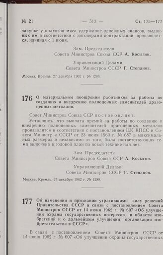 Постановление Совета Министров СССР. О материальном поощрении работников за работы по созданию и внедрению полноценных заменителей драгоценных металлов. 27 декабря 1962 г. № 1289