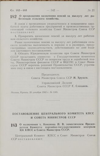 Постановление Совета Министров СССР. О прекращении назначения пенсии за выслугу лет работникам сельского хозяйства. 20 декабря 1962 г. № 1305