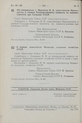 Постановление Совета Министров СССР. Об утверждении т. Макарова В. К. заместителем Председателя и членом Государственного комитета по машиностроению при Госплане СССР. 9 апреля 1964 г. № 276