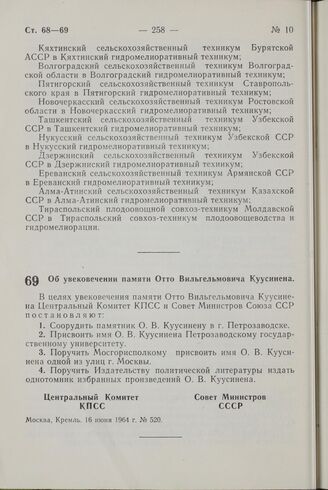 Постановление Центрального Комитета КПСС и Совета Министров СССР. Об увековечении памяти Отто Вильгельмовича Куусинена. 16 июня 1964 г. № 520