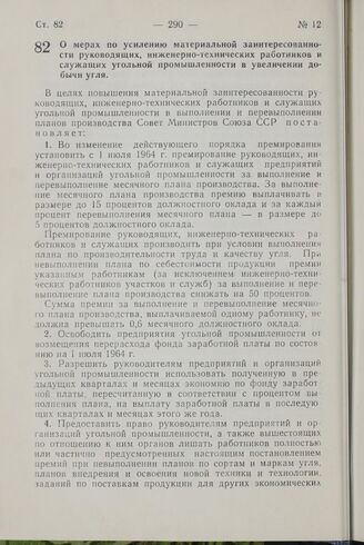 Постановление Совета Министров СССР. О мерах по усилению материальной заинтересованности руководящих, инженерно-технических работников и служащих угольной промышленности в увеличении добычи угля. 17 июля 1964 г. № 594