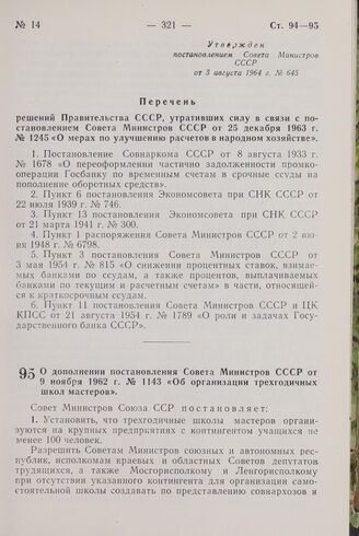 Постановление Совета Министров СССР. О дополнении постановления Совета Министров СССР от 9 ноября 1962 г. № 1143 «Об организации трехгодичных школ мастеров». 3 августа 1964 г, № 646