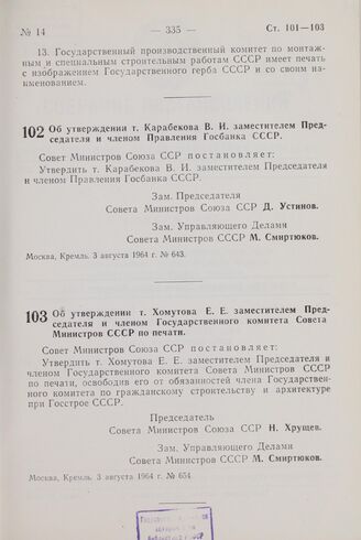 Постановление Совета Министров СССР. Об утверждении т. Карабекова В. И . заместителем Председателя и членом Правления Госбанка СССР. 3 августа 1964 г. Л» 643.