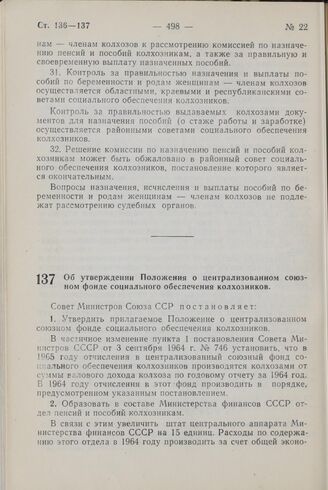Постановление Совета Министров СССР. Об утверждении Положения о централизованном союзном фонде социального обеспечения колхозников. 6 ноября 1964 г. № 919.