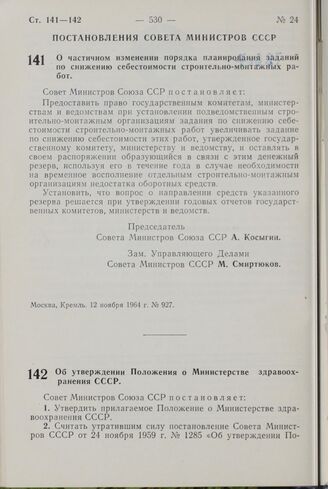 Постановление Совета Министров СССР. Об утверждении Положения о Министерстве здравоохранения СССР. 12 ноября 1964 г. № 928