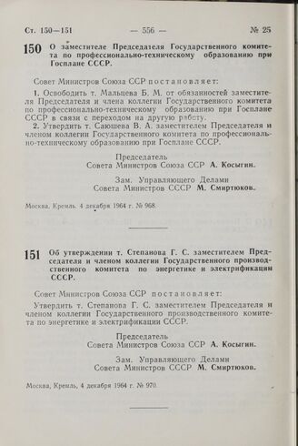Постановление Совета Министров СССР. Об утверждении т. Степанова Г. С. заместителем Председателя и членом коллегии Государственного производственного комитета по энергетике и электрификации СССР. 4 декабря 1964 г. № 970