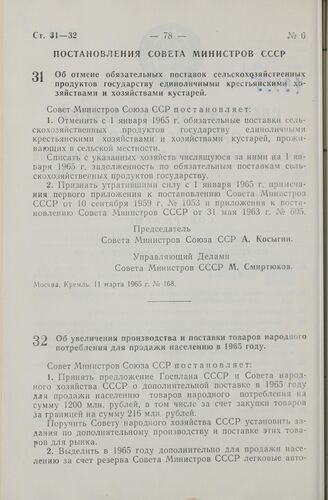 Постановление Совета Министров СССР. Об отмене обязательных поставок сельскохозяйственных продуктов государству единоличными крестьянскими хозяйствами и хозяйствами кустарей. 11 марта 1965 г. № 168