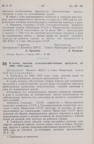 Постановление Центрального Комитета КПСС и Совета Министров СССР. О плане закупок сельскохозяйственных продуктов на 1966—1970 годы. 1 апреля 1965 г. № 264