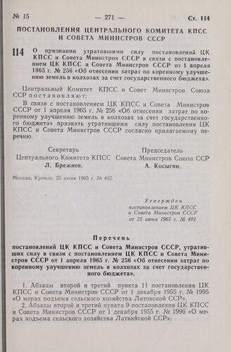 Постановление Центрального Комитета КПСС и Совета Министров СССР. О признании утратившими силу постановлений ЦК КПСС и Совета Министров СССР в связи с постановлением ЦК КПСС и Совета Министров СССР от 1 апреля 1965 г. № 256 «Об отнесении затрат по коренному улучшению земель в колхозах за счет государственного бюджета». 25 июня 1965 г. № 492