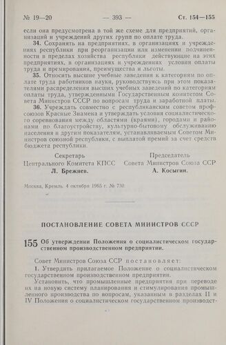 Постановление Совета Министров СССР. Об утверждении Положения о социалистическом государственном производственном предприятии. 4 октября 1965 г. № 731