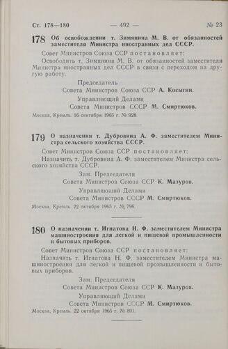 Постановление Совета Министров СССР. О назначении т. Игнатова Н. Ф. заместителем Министра машиностроения для легкой и пищевой промышленности и бытовых приборов. 22 октября 1965 г. № 801