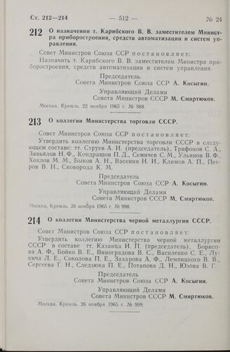 Постановление Совета Министров СССР. О назначении т. Карибского В. В. заместителем Министра приборостроения, средств автоматизации и систем управления. 22 ноября 1965 г. № 988