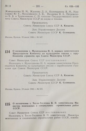 Постановление Совета министров СССР. О назначении т. Тесля-Тесленко В. П. заместителем Министра монтажных и специальных строительных работ СССР. 19 июля 1966 г. № 557
