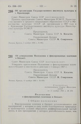 Постановление Совета министров СССР. Об утверждении Положения о фиксированных платежах в бюджет. 11 ноября 1966 г. № 870